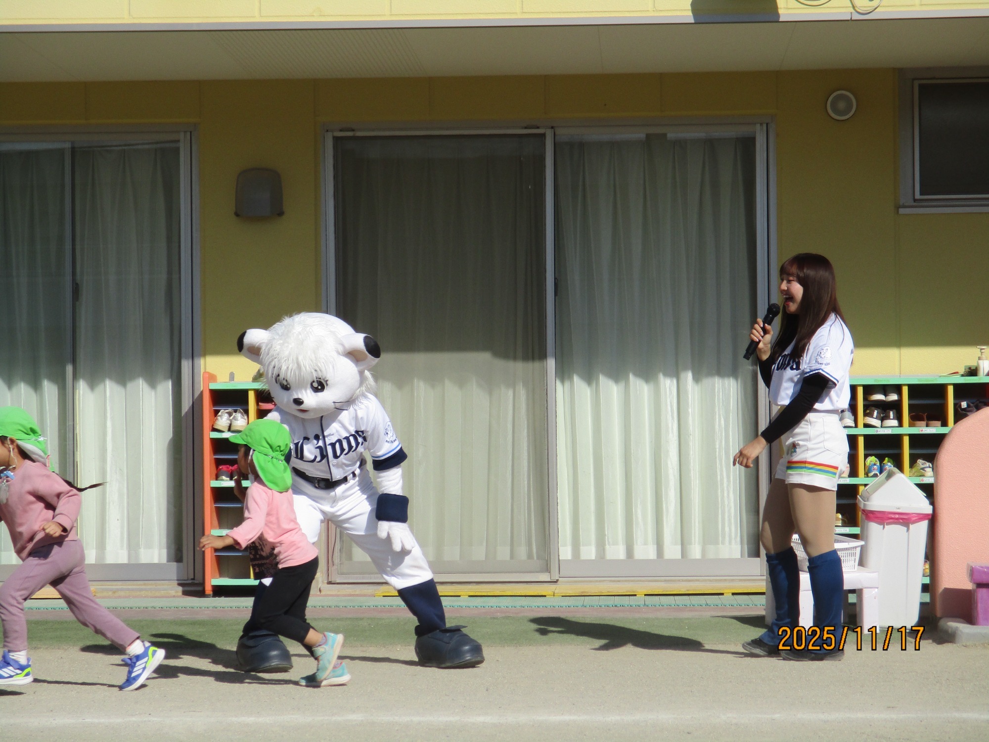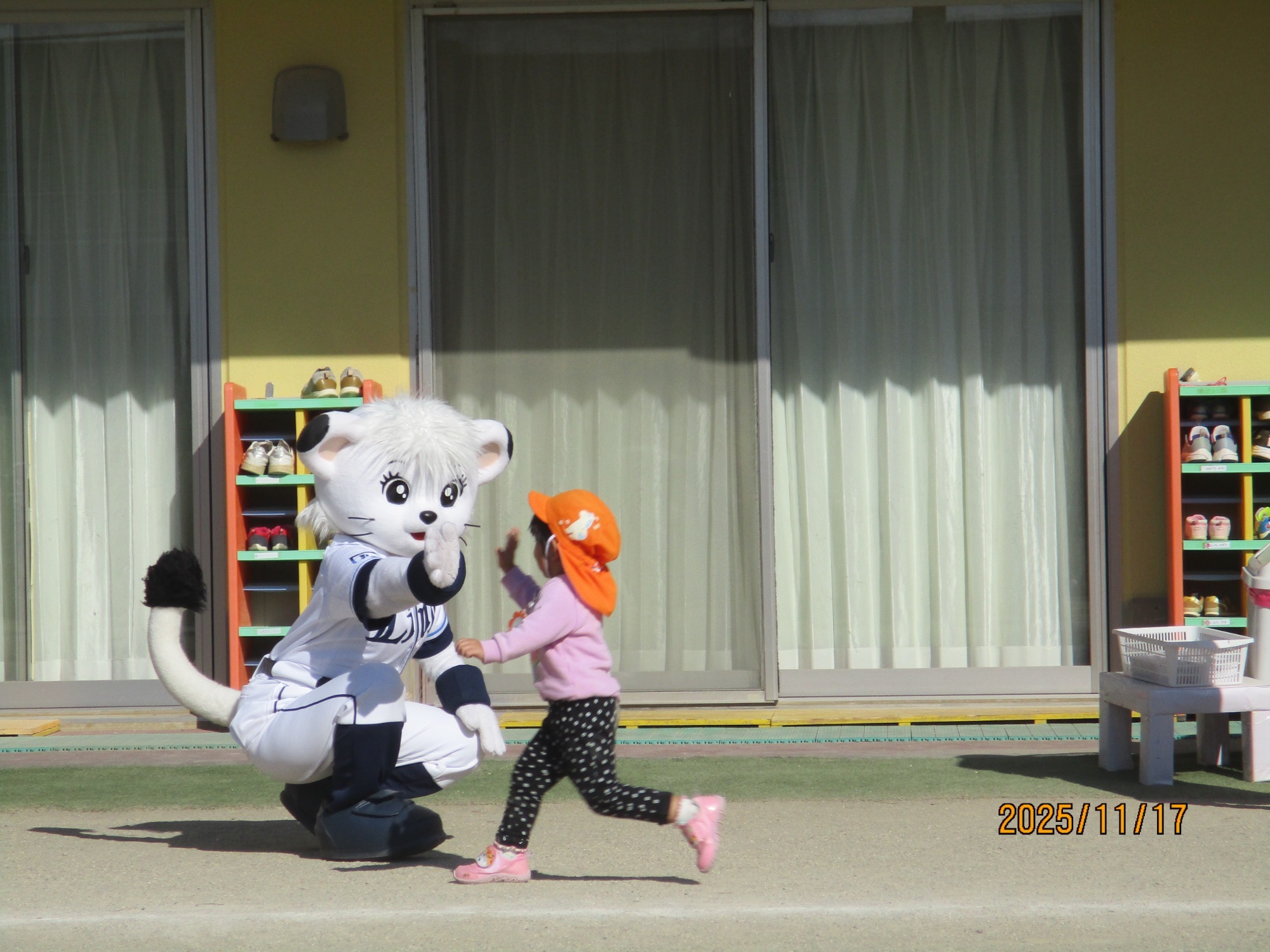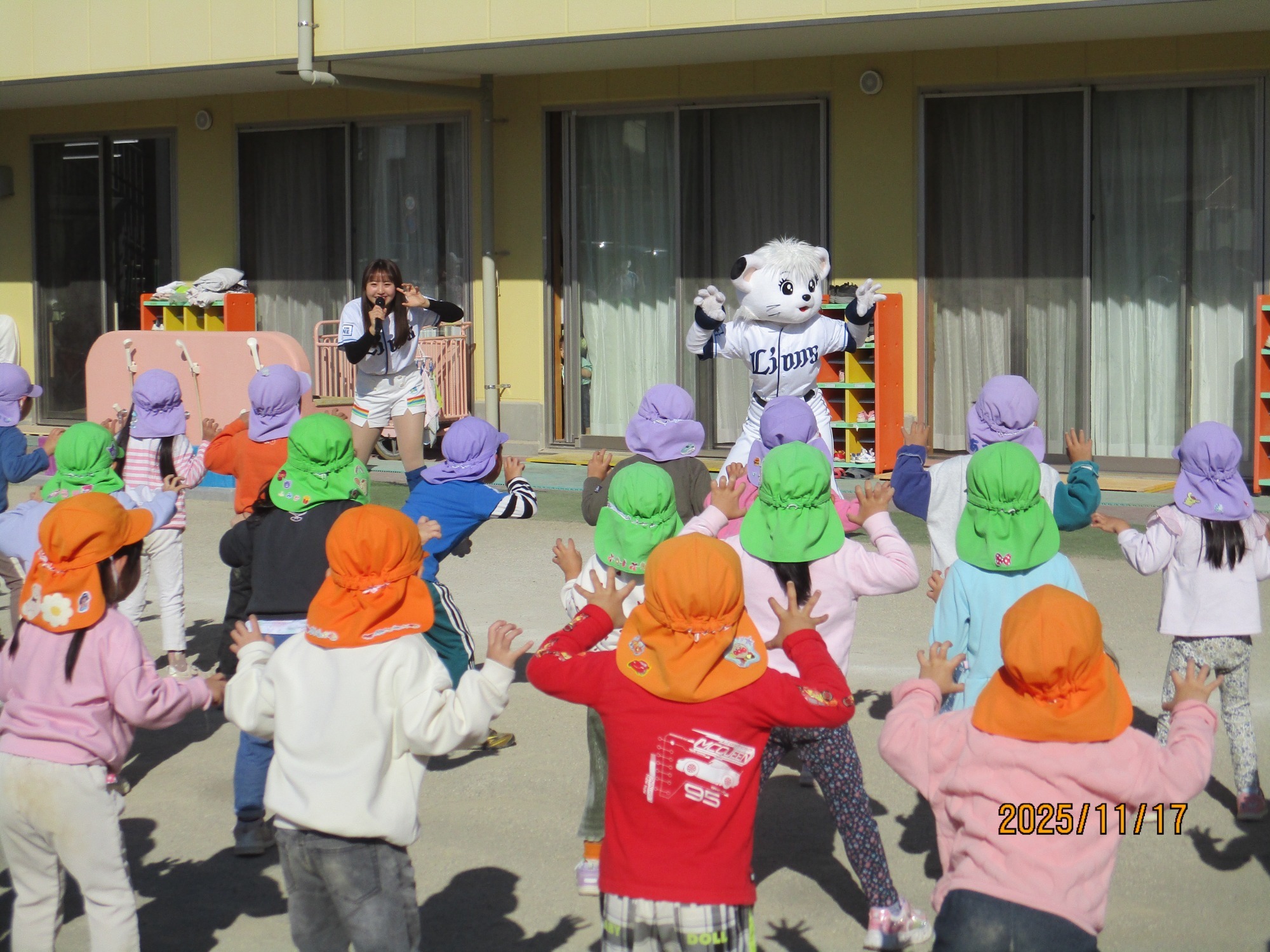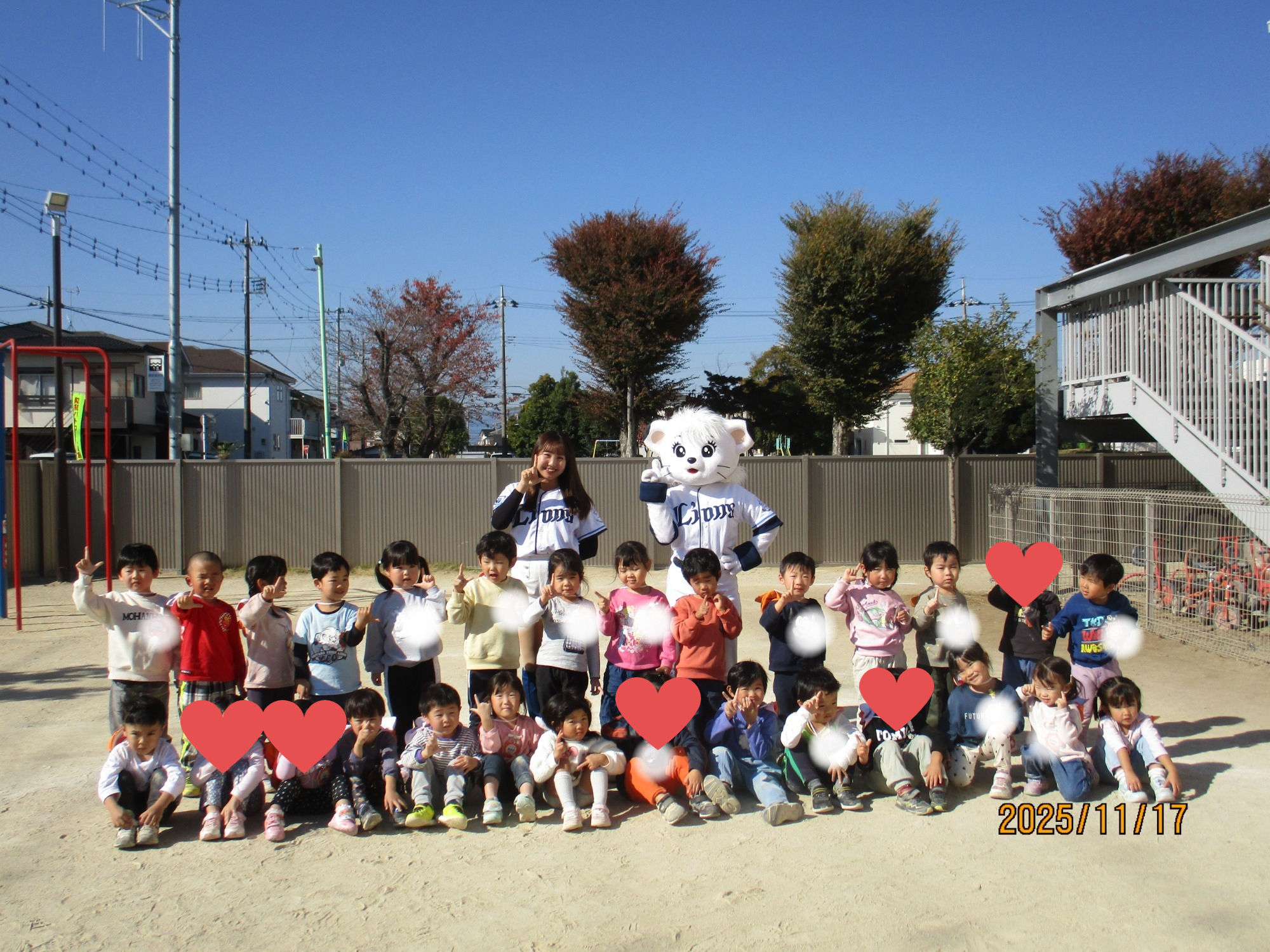 西武ライオンズのマスコット、ライナちゃんが遊びにきてくれました!元気いっ~ぱい、楽しく過ごしました。お友達のダンスやまねっこポーズ、ライナちゃんにほめてもらえたねっ☺クラス写真でのLのポーズもかっこよく決まりました💛