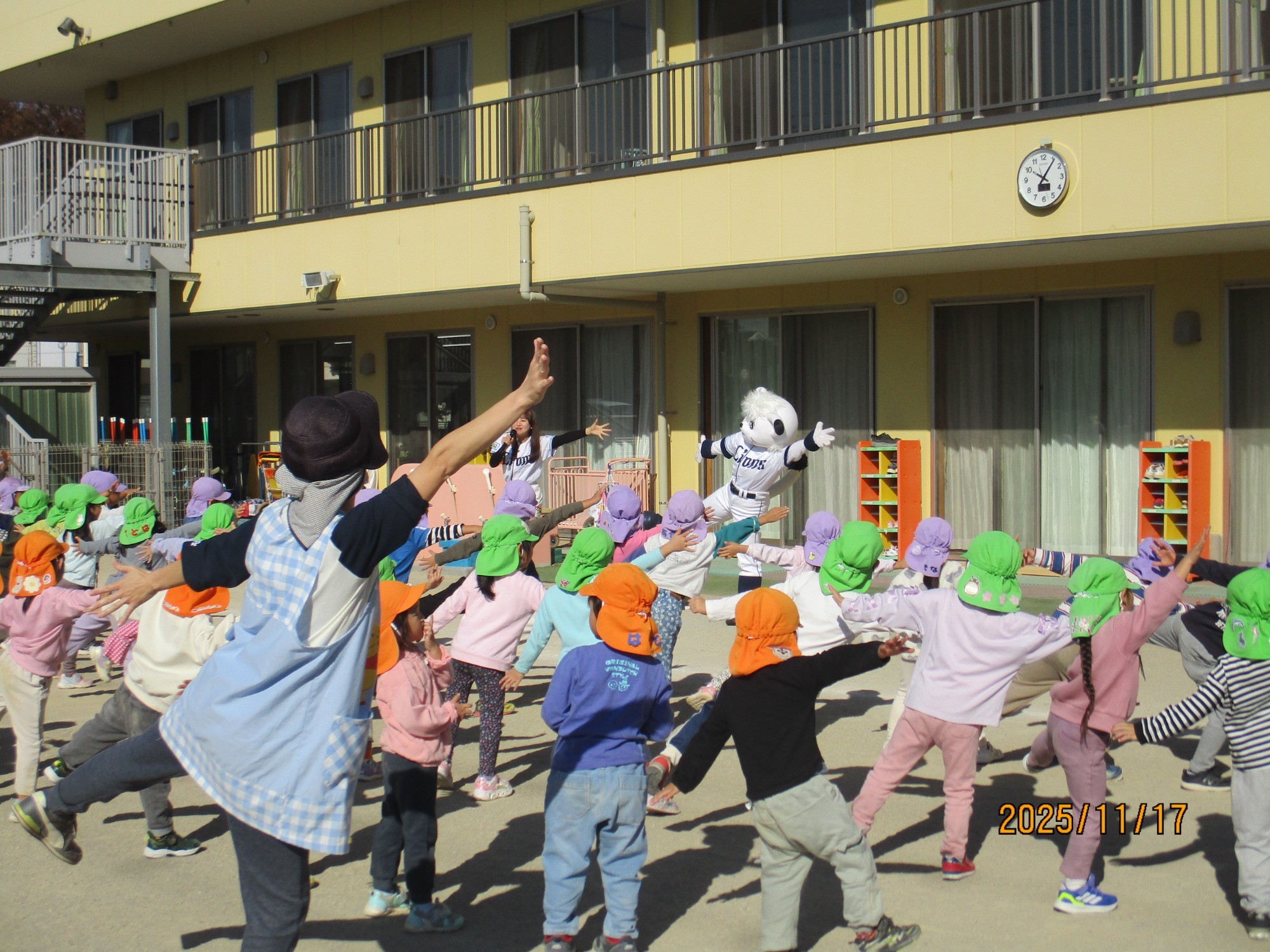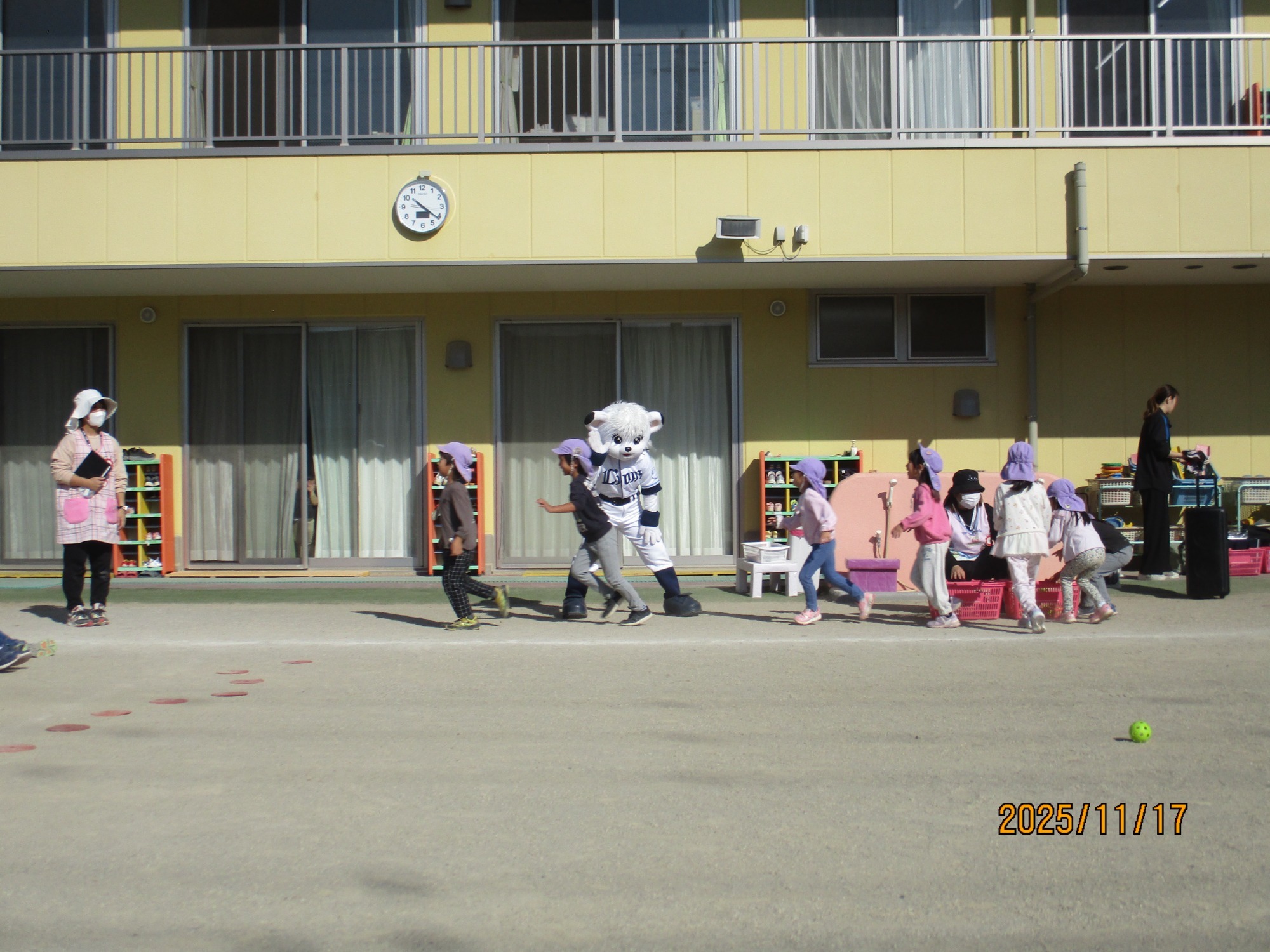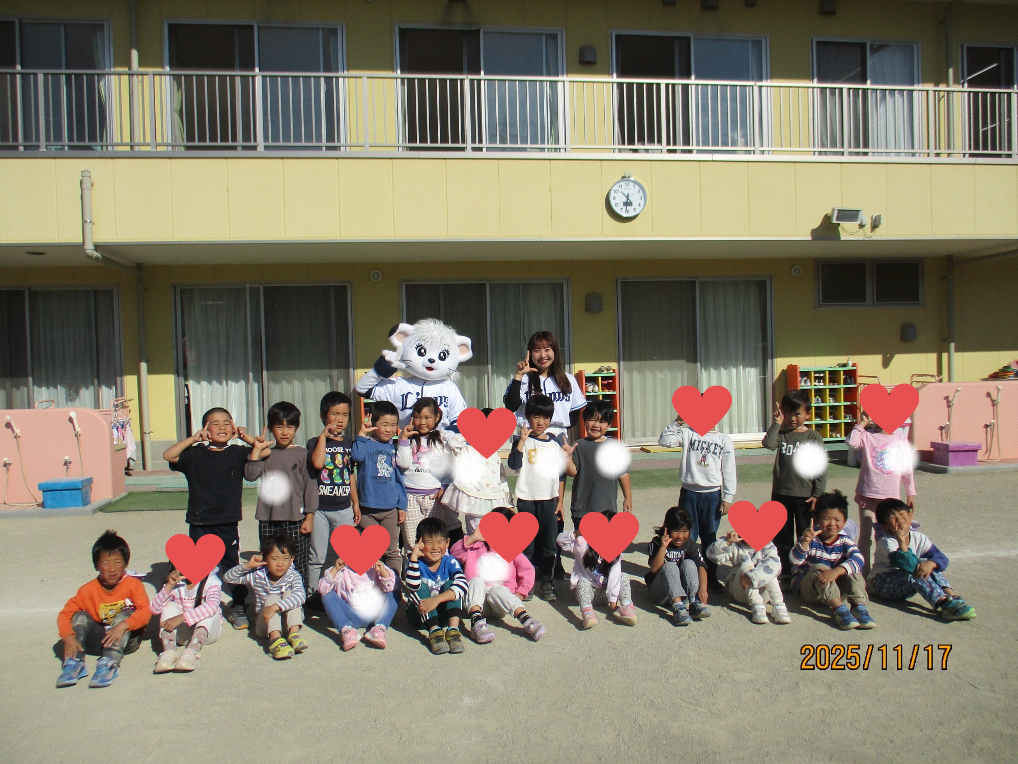 西武ライオンズのマスコット、ライナちゃんが遊びにきてくれました!元気いっ~ぱい、楽しく過ごしました。お友達のダンスやまねっこポーズ、ライナちゃんにほめてもらえたねっ☺クラス写真でのLのポーズもかっこよく決まりました💛