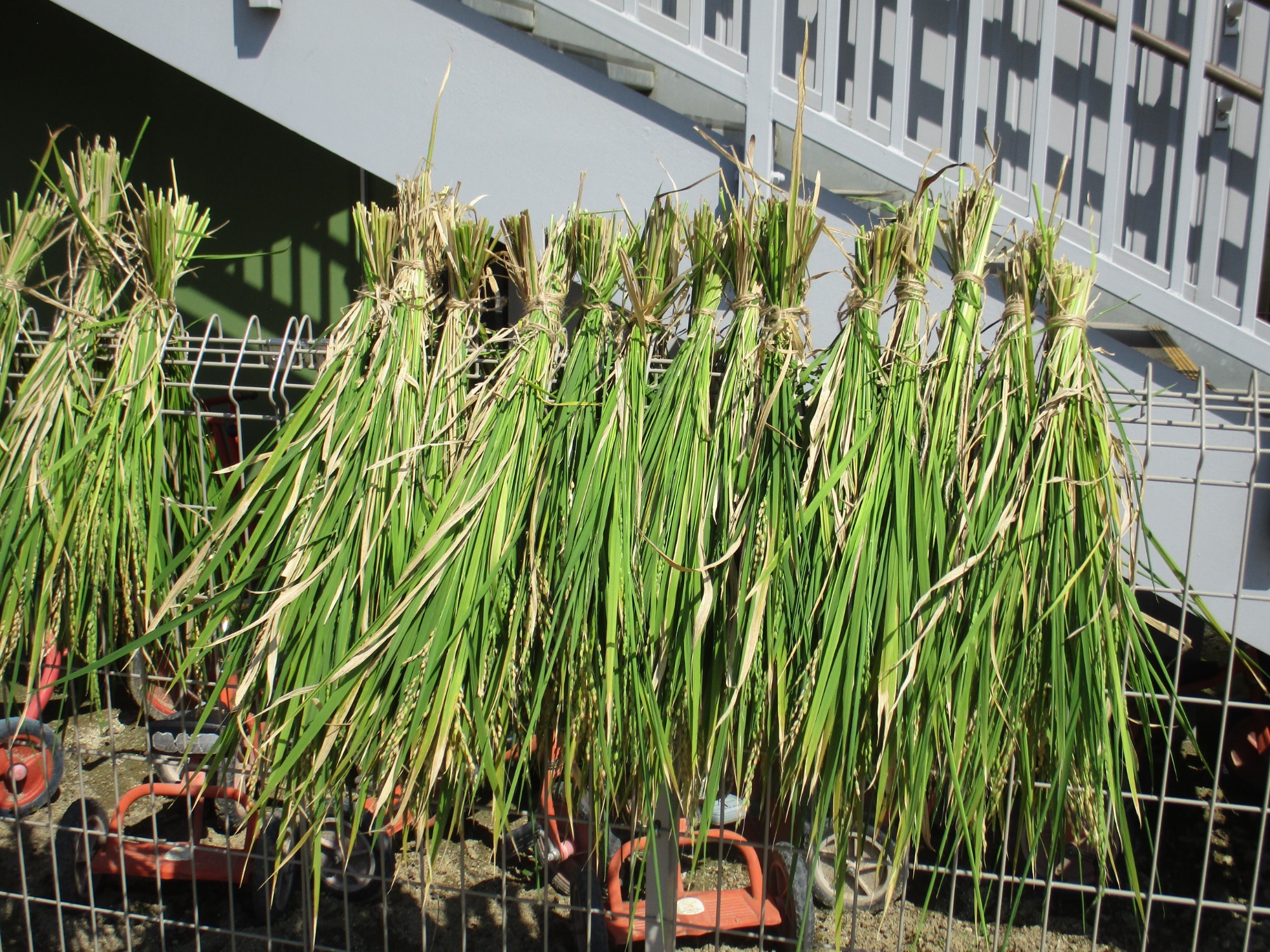 刈り取った稲を束ねて、天日干しにします。後は、お日様の光と風・・・自然の力に任せて・・・おいしくなあれ♪