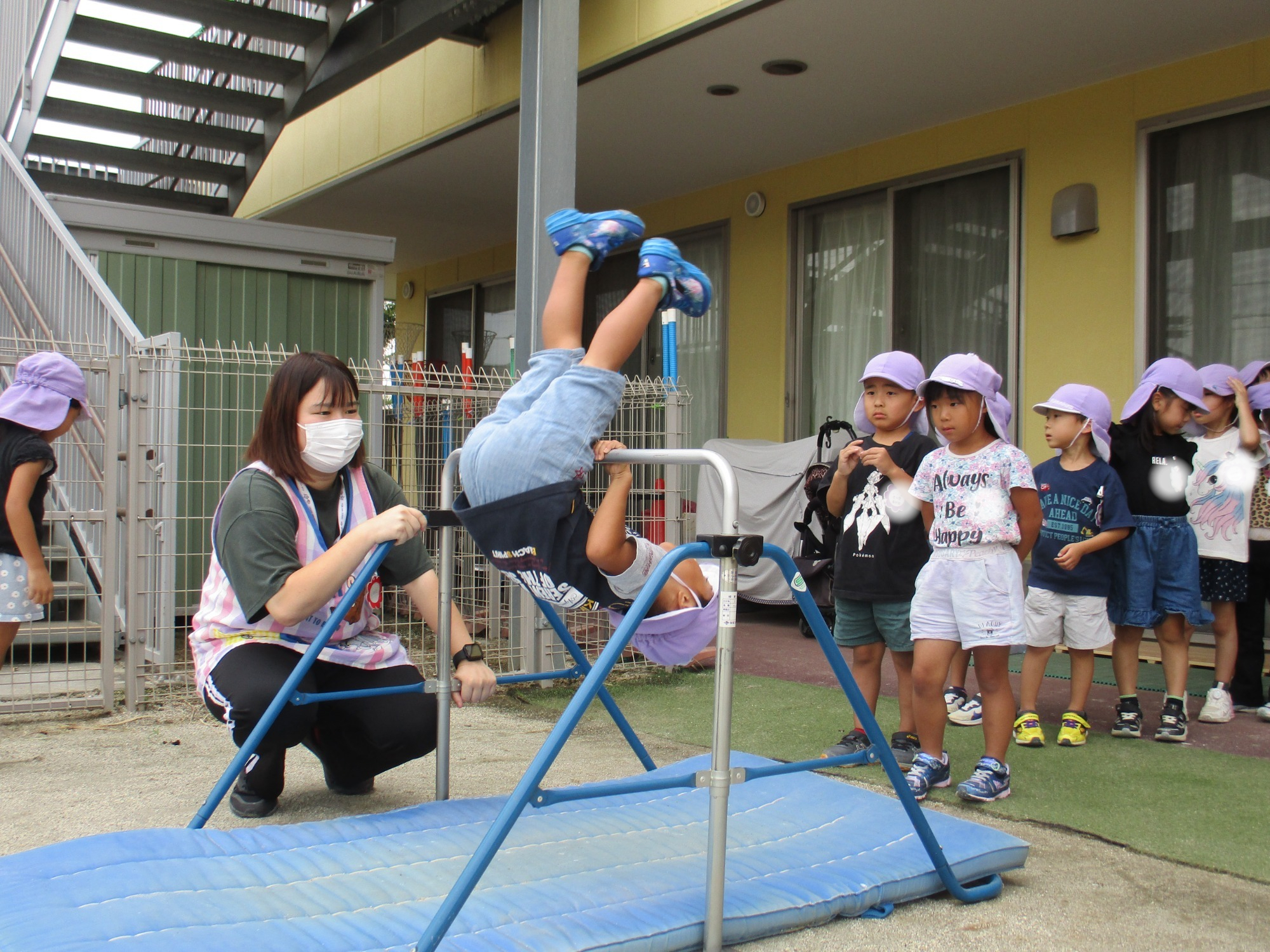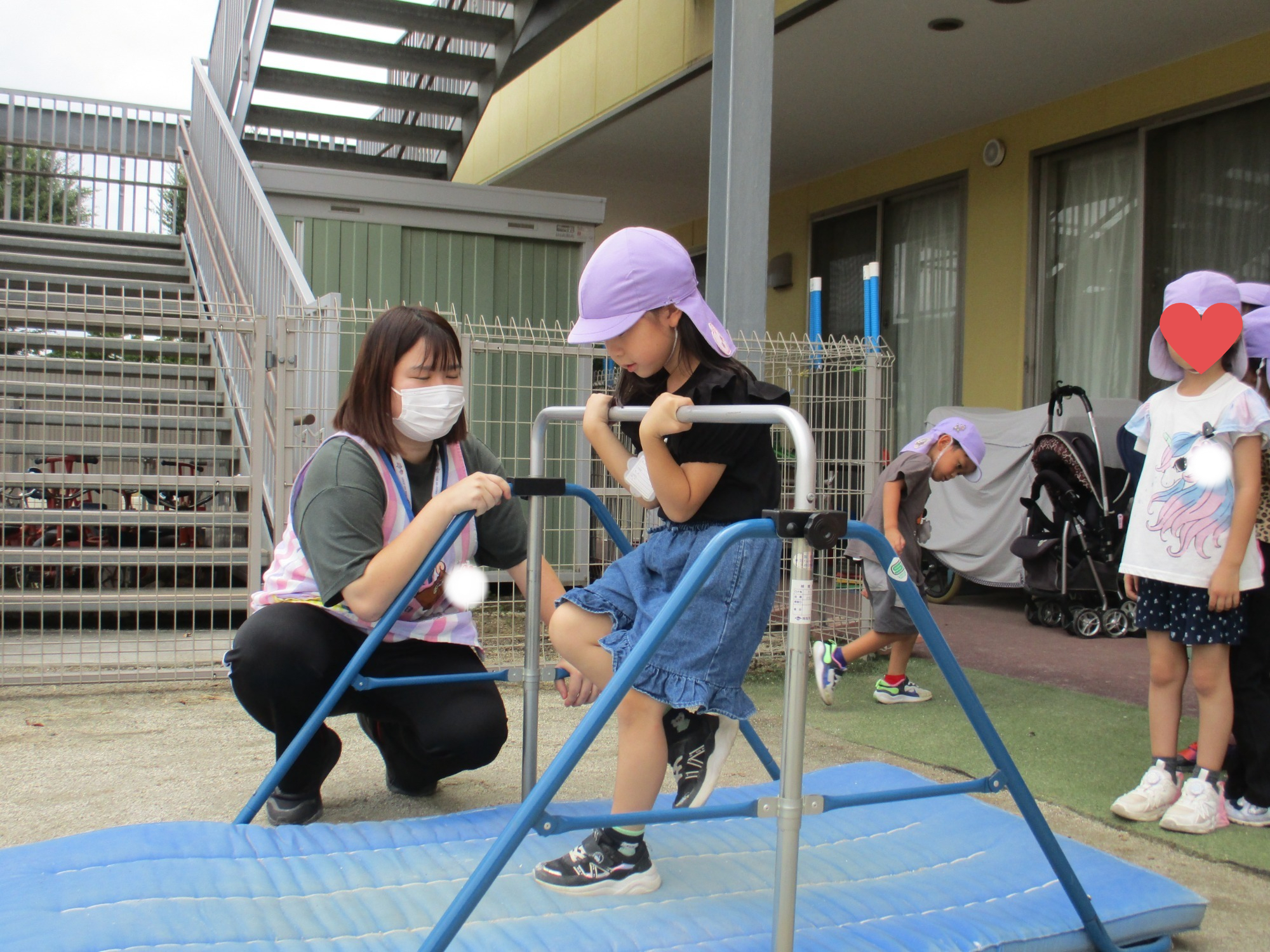 ばら組さんの一輪車の練習が始まっています。鉄棒や昇り棒につかまったり、段階を踏みながらの練習です。何度も何度も失敗を繰り返し…それでも、みんな、へこたれないもんね~凄い!のひとことです。その調子、その調子!がんばれっーーーー!!